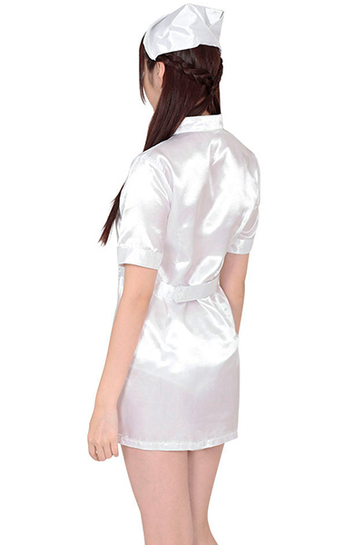 キラキラとした純白生地の光沢感がとってもキレイ!セクシーなミニスカートのワンピースとナースキャップのコスプレセットです。