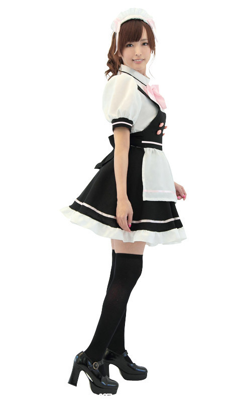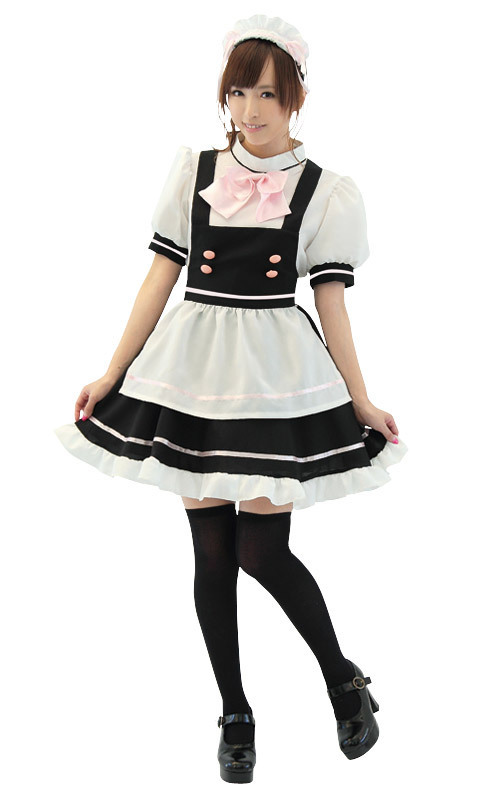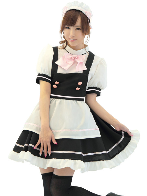 萌え系スタイルに彼も萌え萌えに…!?黒×白のシンプルなメイドワンピースにピンクリボンとピンクボタンを施し、キュートさをプラスした超ラブリーなメイドコスチューム。