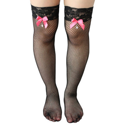 ピンクのリボンチャームが付いた大人可愛い網ストッキング。