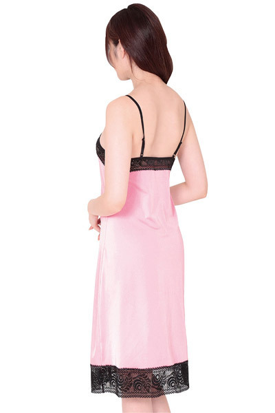 大人リッチな長め丈のロングスリップドレス!身頃は心地よい質感の淡いピンクサテン地、デコルテと裾は繊細レースで縁取った切り替えデザイン。